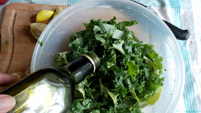 Lalu dikasih olive oil sampai daunnya basah. Kalau untuk makan mentah baiknya pake extra virgin oil. Kalau untuk oseng atau panggang pakai yang gak virgin.